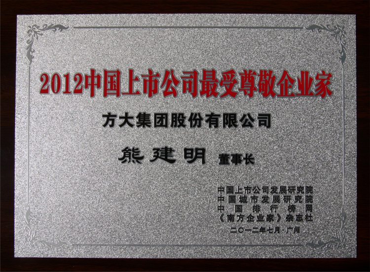 2012年7月30日,“2012中國上市公司最具投資價值100強”排行榜在廣州揭曉,方大集團榮登“中國上市公司最具投資價值100強”榜單,熊建明董事長榮膺“2012中國上市公司最受尊敬企業(yè)家”。