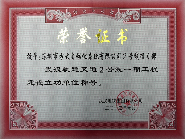 近日,為表彰方大自動化系統(tǒng)有限公司在武漢地鐵2號線一期工程中的突出貢獻(xiàn),武漢地鐵集團(tuán)有限公司授予方大自動化系統(tǒng)有限公司為 “武漢軌道交通2號線一期工程建設(shè)立功單位”稱號。