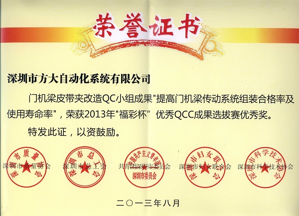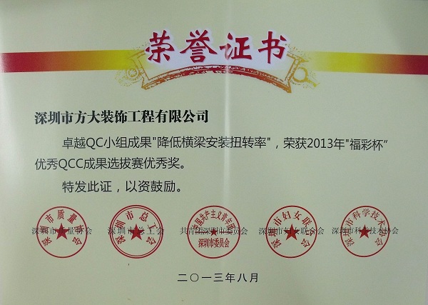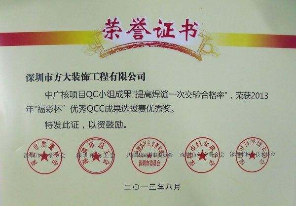 2013年9月24日,方大裝飾工程有限公司獲得由深圳市質(zhì)量協(xié)會、深圳市總工會、共青團(tuán)深圳市委員會、深圳市婦女聯(lián)合會和深圳市科技技術(shù)協(xié)會聯(lián)合頒發(fā)的“2013年深圳市質(zhì)量管理小組活動優(yōu)秀企業(yè)”稱號。同日,由深圳市質(zhì)量協(xié)會、深圳市總工會、共青團(tuán)深圳市委員會、深圳市婦女聯(lián)合會和深圳市科技技術(shù)協(xié)會聯(lián)合評定的“福彩杯”優(yōu)秀QCC成果選拔賽優(yōu)秀獎揭曉。方大裝飾公司卓越QC小組成果“降低橫梁安裝扭轉(zhuǎn)率”、中廣核項目QC小組成果“提高焊縫一次交驗合格率”和方大自動化系統(tǒng)有限公司門機(jī)梁皮帶夾改造QC小組成果“提高門機(jī)梁傳動系統(tǒng)組裝合格率及使用壽命率”被授予 “深圳市2013年‘福彩杯’QCC成果選拔賽優(yōu)秀獎”;集團(tuán)公司企業(yè)管理部尚清波獲得“深圳市質(zhì)量管理小組活動優(yōu)秀推進(jìn)者” 稱號。