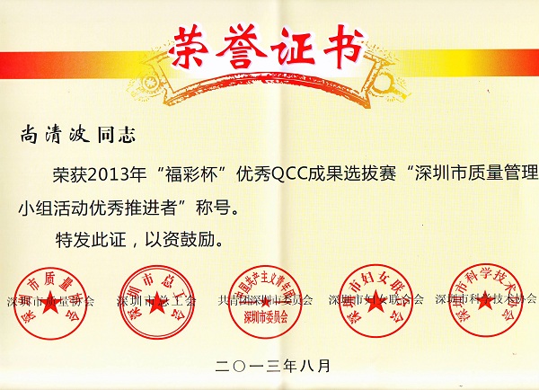 深圳市2013年質(zhì)量管理小組活動優(yōu)秀企業(yè)及“福彩杯”QCC成果選拔賽優(yōu)秀獎是由深圳市質(zhì)量協(xié)會、深圳市科技技術(shù)協(xié)會、深圳市總工會、深圳市婦女聯(lián)合會和共青團(tuán)深圳市委員會聯(lián)合評定,旨在表彰在2012年度深圳市質(zhì)量管理小組活動中涌現(xiàn)出的優(yōu)秀企業(yè)和優(yōu)秀QC小組。質(zhì)量管理小組活動優(yōu)秀企業(yè)是由同一工作場所的不同企業(yè)員工組成質(zhì)量管理小組,運(yùn)用質(zhì)量管理的簡易統(tǒng)計手法及工具,分析解決工作場所的問題以改善業(yè)績的質(zhì)量管理活動。