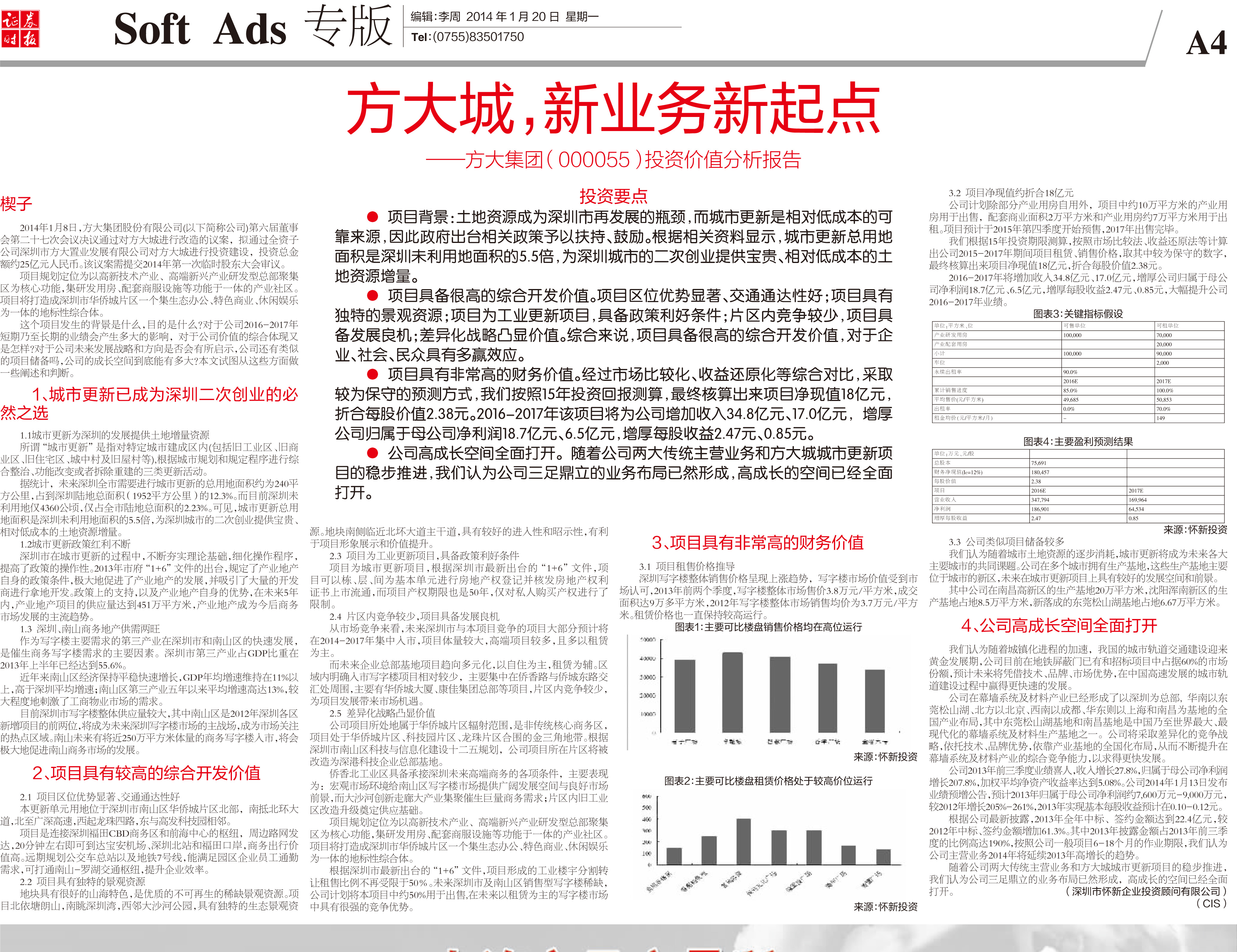 2014年1月20日《證券時報》專版大幅刊登《方大城,新業(yè)務(wù)新起點——方大集團投資價值分析報告》