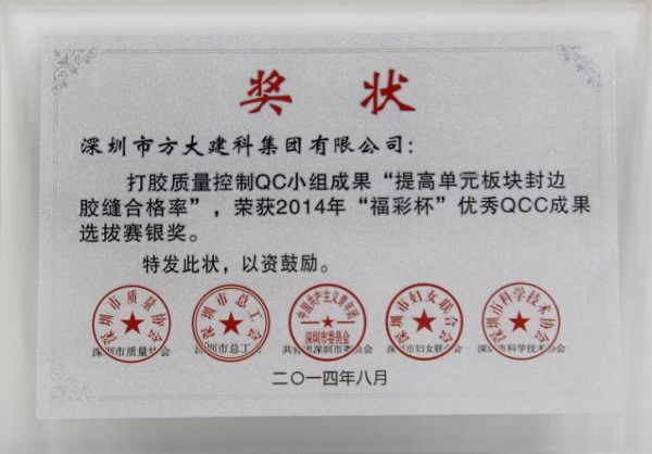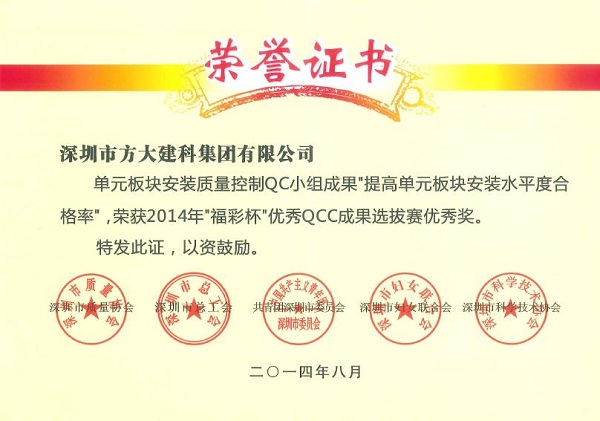 9月26日,方大建科公司獲得由深圳市質(zhì)量協(xié)會(huì)、深圳市總工會(huì)、共青團(tuán)深圳市委員會(huì)、深圳市婦女聯(lián)合會(huì)和深圳市科技技術(shù)協(xié)會(huì)聯(lián)合頒發(fā)的“2014年深圳市質(zhì)量管理小組活動(dòng)優(yōu)秀企業(yè)”稱號(hào)。同日,由深圳市質(zhì)量協(xié)會(huì)、深圳市總工會(huì)、共青團(tuán)深圳市委員會(huì)、深圳市婦女聯(lián)合會(huì)和深圳市科技技術(shù)協(xié)會(huì)聯(lián)合評(píng)定的“福彩杯”優(yōu)秀QCC成果優(yōu)秀獎(jiǎng)揭曉。方大建科公司打膠質(zhì)量控制QC小組成果“提高單元板塊封邊合格率”榮獲2014年“福彩杯”QCC成果選拔賽銀獎(jiǎng),方大建科公司單元板塊安裝質(zhì)量控制QC小組成果“提高單元板塊安裝水平度合格率”,方大建科公司石材幕墻安裝質(zhì)量控制QC小組成果“確保石材面板安裝接縫合格率”、 方大自動(dòng)化公司門機(jī)梁皮帶夾改造QC小組成果“提高門機(jī)梁傳動(dòng)系統(tǒng)組裝合格率及使用壽命率”榮獲“深圳市2014年‘福彩杯’QCC成果選拔賽優(yōu)秀獎(jiǎng)”, 集團(tuán)公司企業(yè)管理部尚清榮獲“深圳市質(zhì)量管理小組活動(dòng)卓越領(lǐng)導(dǎo)者”稱號(hào),方大建科公司張錦德榮獲“深圳市質(zhì)量管理小組活動(dòng)優(yōu)秀推進(jìn)者” 稱號(hào)。