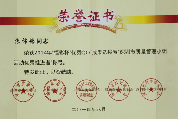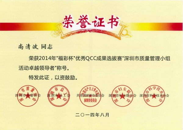 深圳市2014年質(zhì)量管理小組活動(dòng)優(yōu)秀成果、優(yōu)秀企業(yè)和先進(jìn)個(gè)人獎(jiǎng)是由深圳市質(zhì)量協(xié)會(huì)、深圳市總工會(huì)、共青團(tuán)深圳市委員會(huì)、深圳市婦女聯(lián)合會(huì)和深圳市科技技術(shù)協(xié)會(huì)聯(lián)合審定,旨在表彰在2014年深圳市質(zhì)量管理小組活動(dòng)中涌現(xiàn)出的優(yōu)秀企業(yè)和優(yōu)秀QC小組和個(gè)人。