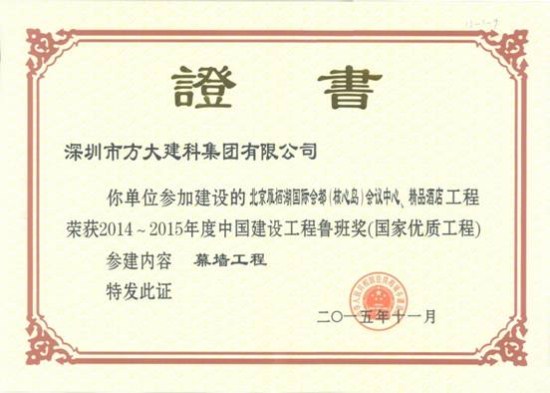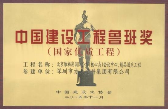 11月17日,中國建筑業(yè)協(xié)會(huì)在北京舉行中國建筑行業(yè)最高獎(jiǎng)——2014~2015年度中國建設(shè)工程魯班獎(jiǎng)(國家優(yōu)質(zhì)工程)表彰大會(huì),在本屆魯班獎(jiǎng)表彰大會(huì)中,方大集團(tuán)股份有限公司全資子公司深圳市方大建科集團(tuán)有限公司憑借精心打造的高標(biāo)準(zhǔn)、高質(zhì)量幕墻工程的北京雁棲湖國際會(huì)都精品酒店,獲得2014~2015年度中國建設(shè)工程魯班獎(jiǎng),“方大品質(zhì)”作為“深圳質(zhì)量”的典范再度被全國建筑工程領(lǐng)域所矚目。