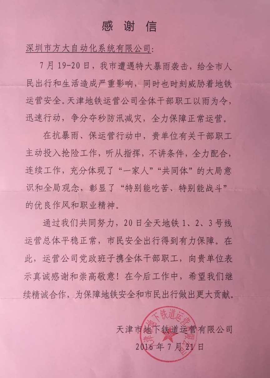 近日,天津地鐵運(yùn)營(yíng)公司向方大自動(dòng)化系統(tǒng)有限公司發(fā)來感謝信,高度評(píng)價(jià)自動(dòng)化公司在天津地鐵“抗暴雨、保運(yùn)營(yíng)”行動(dòng)中的優(yōu)良表現(xiàn)。感謝信說,7月19日至20日,天津市遭遇特大暴雨,地鐵運(yùn)營(yíng)面臨威脅,自動(dòng)化公司員工主動(dòng)投入搶險(xiǎn)工作,聽從指揮,連續(xù)工作,彰顯了“特別能吃苦,特別能戰(zhàn)斗”的優(yōu)良作風(fēng)和職業(yè)精神,天津地鐵公司對(duì)此表示真誠感謝和崇高敬意,希望繼續(xù)精誠合作。