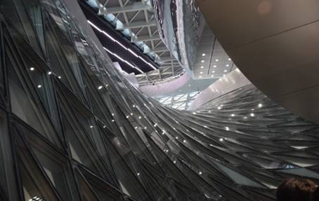 別具匠心體現(xiàn)創(chuàng)新能力。本項目的另一大亮點就是室內(nèi)的云雕塑下方的勺子幕墻系統(tǒng),因為其形狀像一把湯勺而得名,其實是一個雙面雙層扭曲的、兼具防火隔斷功能的室內(nèi)幕墻系統(tǒng),該幕墻的主體異形鋼結(jié)構(gòu)由方大人設(shè)計、施工完成,工期只用了30天。
