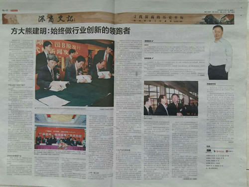 2016年12月7日,《深圳晚報》深商史記欄目以兩個整版超大篇幅報道方大集團(tuán)股份有限公司董事長熊建明的風(fēng)雨創(chuàng)業(yè)歷程,講述了熊建明董事長20多年來在建筑新材料、節(jié)能環(huán)保等行業(yè)領(lǐng)域的奮斗故事,記錄了他把方大集團(tuán)從3萬元起家、市場為零的小公司,培育成領(lǐng)先國內(nèi)同行、坐擁多項技術(shù)成就獎的領(lǐng)袖級企業(yè)的傳奇經(jīng)歷,淋漓盡致地展現(xiàn)了熊建明董事長“敢為天下先”的奮斗姿態(tài)和樸實的創(chuàng)業(yè)情懷。