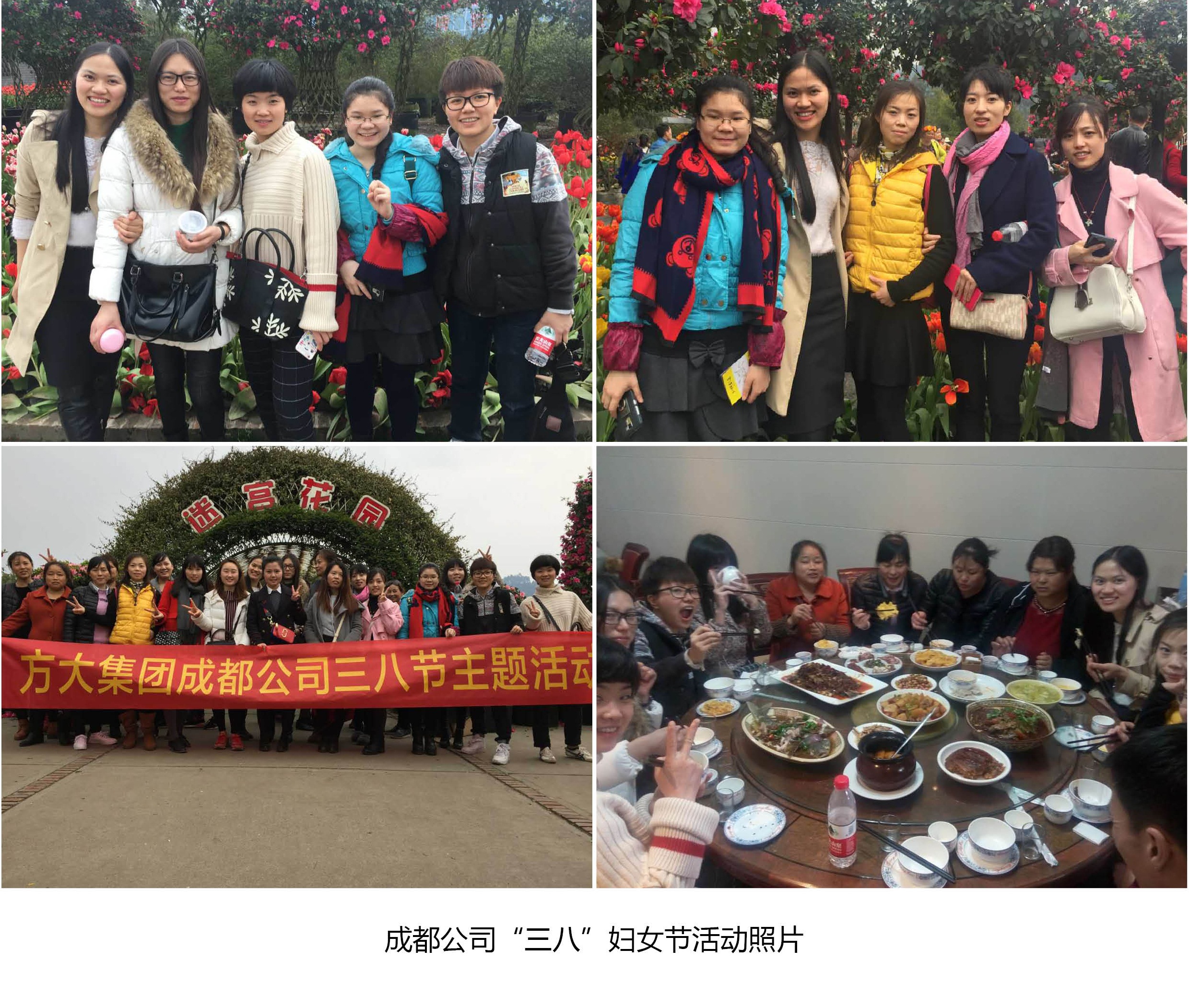 在成都,成都公司組織全體女員工前往位于成都市南郊的“花舞人間”國(guó)家4A級(jí)景區(qū)進(jìn)行半日游活動(dòng)。期間,大家進(jìn)行了賞花、趣味小游戲和聚餐等。此次活動(dòng)有效的增進(jìn)了方大成都公司女員工彼此間的情誼,豐富了公司的企業(yè)文化。