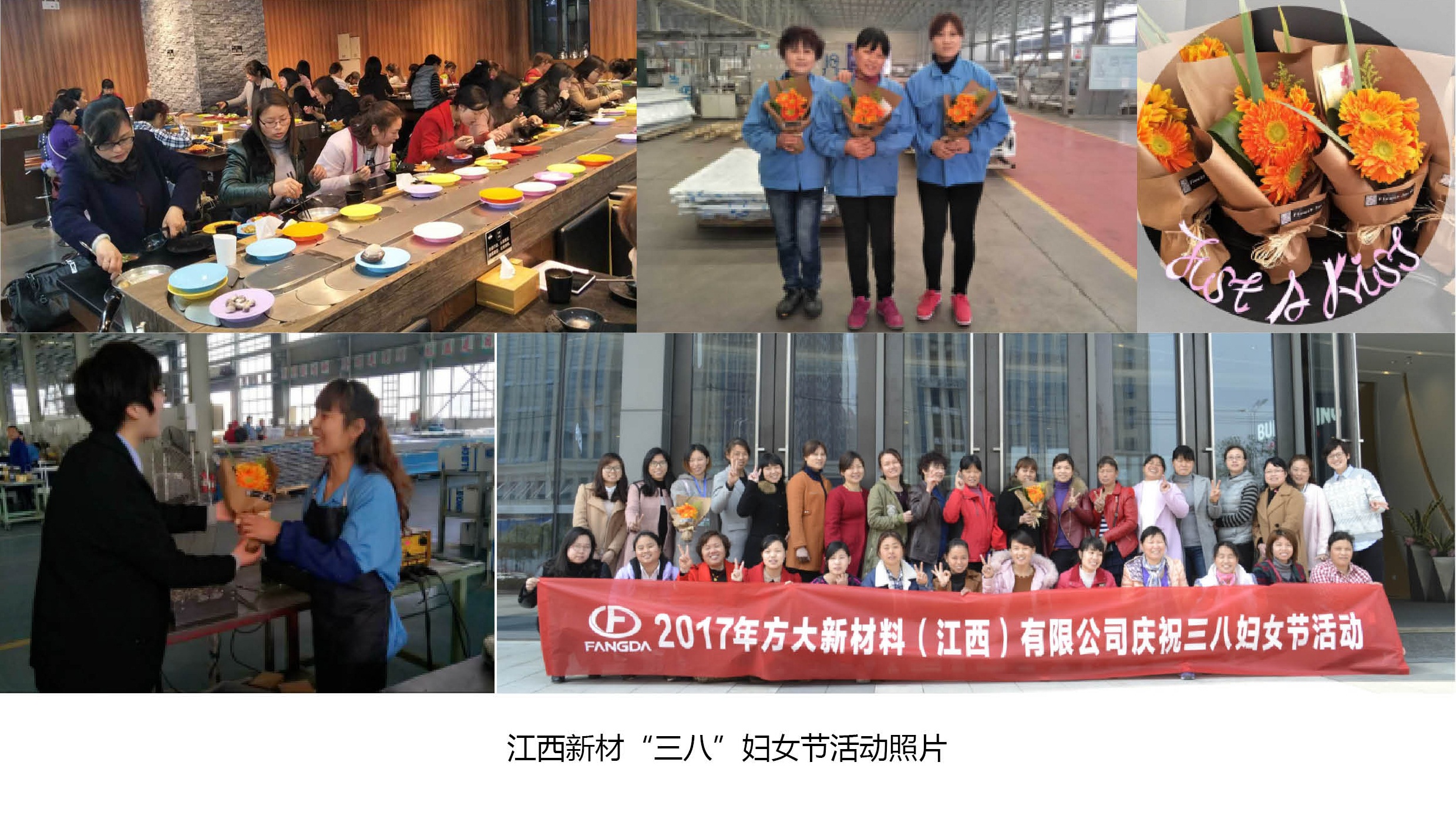 在南昌,江西新材組織了以“愛自己、愛生活”為主題的婦女節(jié)系列活動(dòng),共54名女員工參與其中?;顒?dòng)內(nèi)容包括:向女同事送花、合影留念、自助火鍋用餐等。3月8日上午,江西新材行政人事部經(jīng)理吳宇華帶領(lǐng)送花小分隊(duì),向正在崗位上工作的各位女同事遞上一束艷麗的花,表達(dá)公司對(duì)女員工節(jié)日問候。中午時(shí)間,全體女員工在廣場(chǎng)合影留念,隨后前往一回旋自助火鍋店聚餐。江西新材以平凡簡(jiǎn)單的方式,贏得了女員工們滿滿的感動(dòng)。女員工們紛紛表示,今年的“三八”婦女節(jié)系列活動(dòng)有驚喜、有創(chuàng)新、更有感動(dòng)。