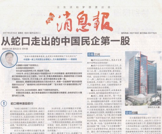 6月16日,《蛇口消息報(bào)》刊登題為“從蛇口走出的中國民企第一股”專訪文章,重點(diǎn)報(bào)道國內(nèi)首家上市民營企業(yè)——方大集團(tuán)股份有限公司作為蛇口精神的傳承者,成立26年來始終秉承“科技為本,創(chuàng)新為源”的經(jīng)營理念,不忘初心,砥礪前行,在節(jié)能環(huán)保領(lǐng)域不斷取得令人矚目的成就。當(dāng)前,方大集團(tuán)正積極參與“一帶一路”國際合作和“粵港澳大灣區(qū)”建設(shè),大力拓展海外市場,努力將方大高端幕墻系統(tǒng)、方大軌道交通站臺屏蔽門等創(chuàng)新成果推向全世界。