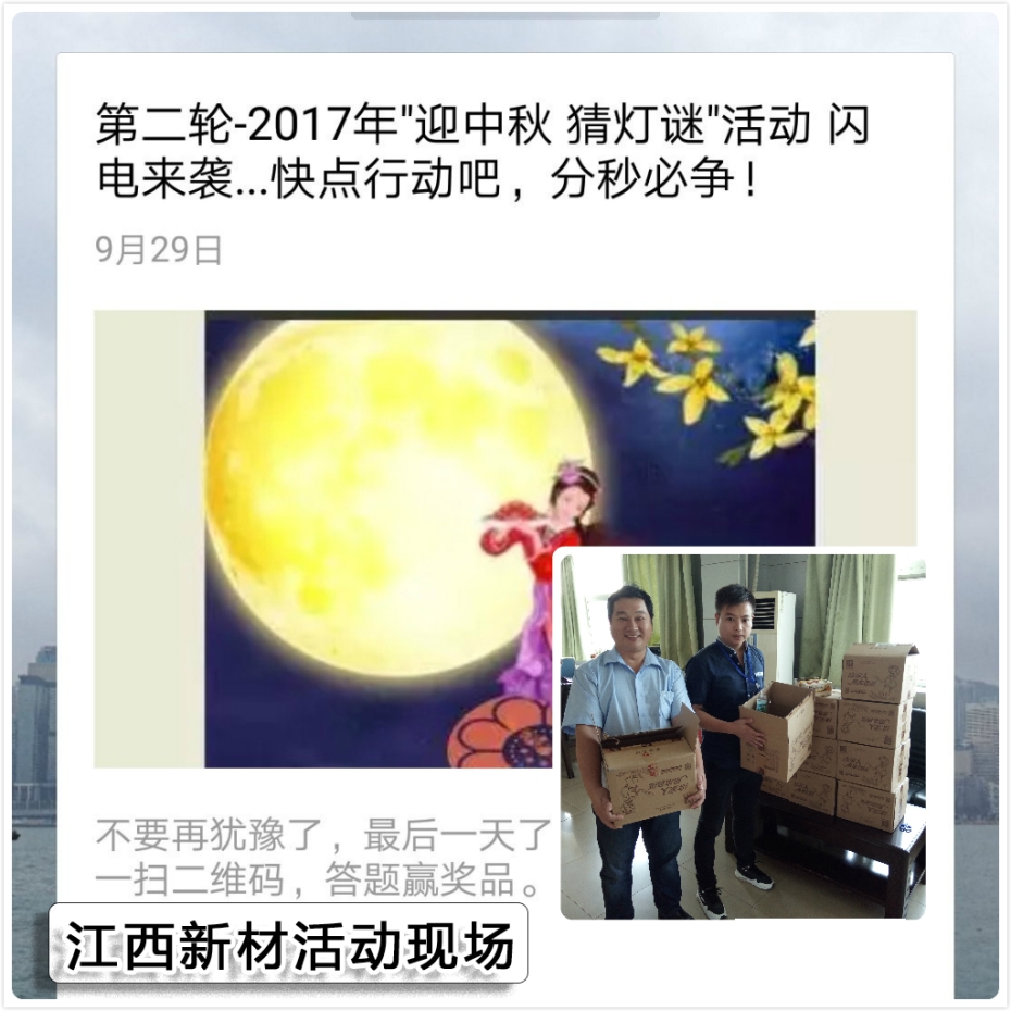 在方大集團(tuán)江西公司,9月28日、29日舉行了一次別開(kāi)生面的“迎中秋猜燈謎”線上活動(dòng)。為了讓公司員工感受到節(jié)日濃厚的氣氛,同時(shí)又能搭建企業(yè)文化交流的橋梁,此次活動(dòng)由傳統(tǒng)猜燈謎改為微信猜燈謎方式進(jìn)行。員工們通過(guò)關(guān)注公司微信公眾號(hào)后,即可在線參與解答猜燈謎的活動(dòng)。通過(guò)這次“迎中秋猜燈謎”活動(dòng),極大地激發(fā)了員工們關(guān)注公司微信公眾平臺(tái)的激情,也為員工們留下了一段難忘的節(jié)日回憶。