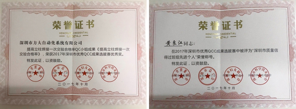 11月14日,深圳市第三十屆優(yōu)秀質量管理小組活動表彰大會在深圳市建科院舉行,方大集團股份有限公司全資子公司深圳市方大自動化系統(tǒng)有限公司“提高立柱焊接一次交驗合格率QC小組”榮獲“2017年深圳市優(yōu)秀QCC成果選拔賽優(yōu)秀獎”,自動化公司質量安全部黃良江榮獲“深圳市質量信得過班組先進個人”榮譽稱號。