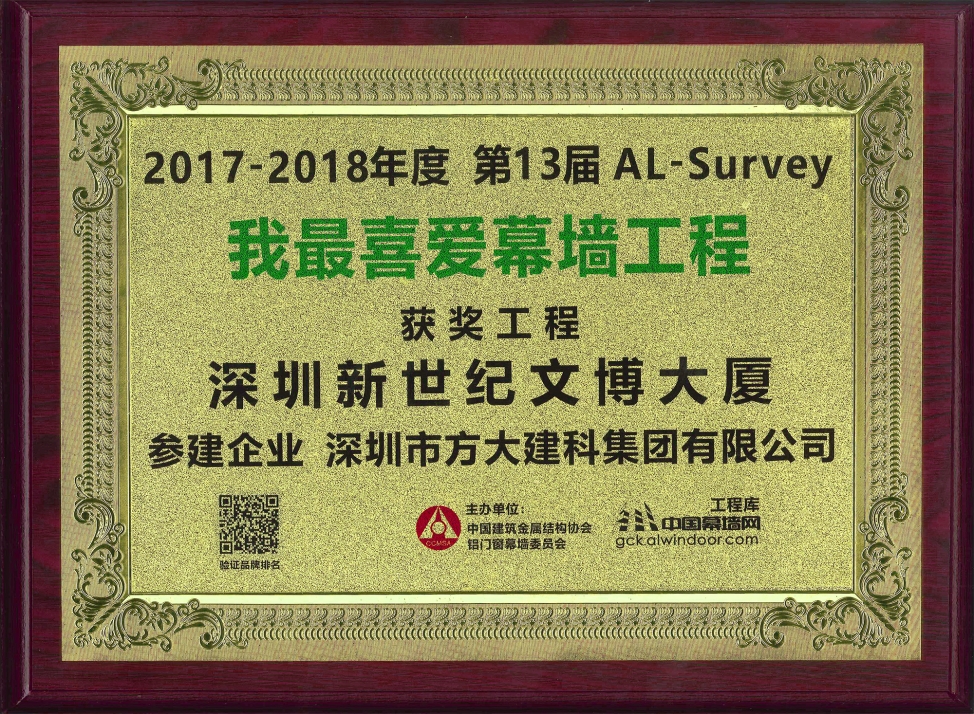第13屆“我最喜愛(ài)幕墻工程”評(píng)選活動(dòng)由中國(guó)建筑金屬結(jié)構(gòu)協(xié)會(huì)鋁門(mén)窗幕墻委員會(huì)、中國(guó)幕墻網(wǎng)聯(lián)合發(fā)起,經(jīng)廣大網(wǎng)友投票及專(zhuān)家評(píng)審,方大建科承建幕墻工程的深圳新世紀(jì)文博大廈最終以216740的高票和專(zhuān)家五星評(píng)價(jià)獲獎(jiǎng)。