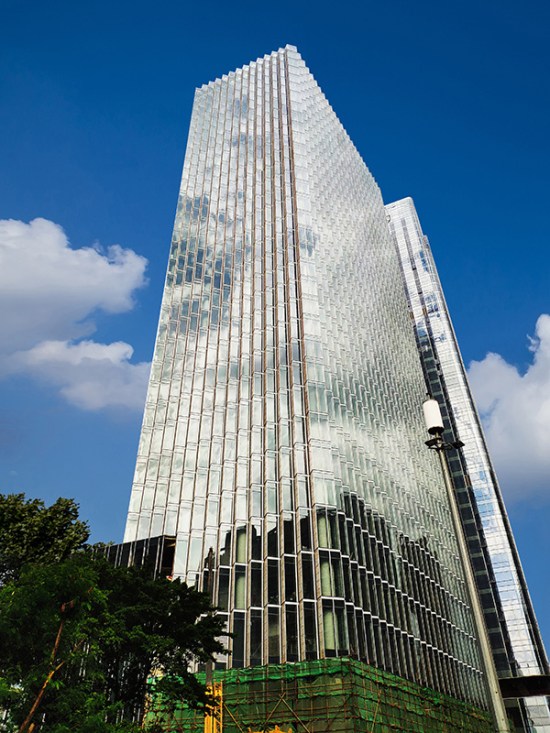 深圳·萬(wàn)科濱海置地大廈位于深圳市福田區(qū),幕墻類型主要是鋸齒狀單元式玻璃+石材+穿孔鋁板幕墻。項(xiàng)目塔樓采用L型和I型單元板塊組成,面板采用蜂窩石材、中空夾膠玻璃和穿孔鋁板。為了增強(qiáng)幕墻系統(tǒng)的通風(fēng)性能,在穿孔鋁板后側(cè)設(shè)置了內(nèi)開(kāi)的鋁板窗。鋸齒狀的幕墻類型和特色材料的組合使該項(xiàng)目成為濱河大道上的一道靚麗風(fēng)景,同時(shí)也給設(shè)計(jì)施工帶來(lái)了難題,項(xiàng)目團(tuán)隊(duì)通過(guò)三維模擬確保L型板塊與I型板塊精確插接,對(duì)使用高度157m的蜂窩石材連接方案進(jìn)行了加強(qiáng)措施,并順利通過(guò)幕墻專家專項(xiàng)的評(píng)審。