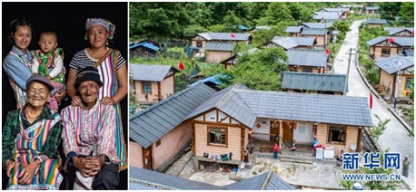 這是一張拼版照片。左圖:怒江傈僳族自治州貢山縣獨龍江鄉(xiāng)迪政當村獨龍族的“文面女”李文仕(前排左)一家合影(6月21日攝);右圖:李文仕和其他村民的房子(6月21日攝),這些房子是當?shù)卣?011年統(tǒng)一修建的。新華社記者 江文耀 攝