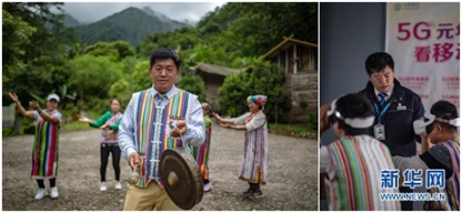 這是一張拼版照片。左圖:在怒江傈僳族自治州貢山縣獨龍江鄉(xiāng)移動營業(yè)廳上班的馬春海(獨龍族)。在他身后,獨龍族群眾在跳本民族舞蹈(6月21日攝);右圖:馬春海在指導當?shù)厝罕婓w驗5G虛擬現(xiàn)實設(shè)備。獨龍江鄉(xiāng)今年開通了5G試驗基站(6月21日攝)。新華社記者 江文耀