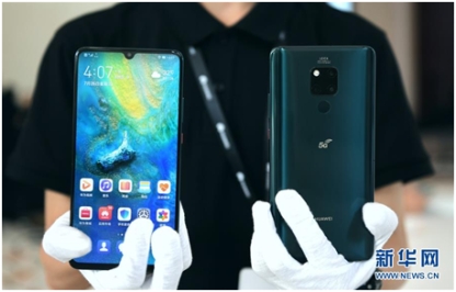 工作人員展示華為公司發(fā)布的首款5G商用手機——華為Mate 20 X 5G(7月26日攝)。新華社記者 毛思倩 攝