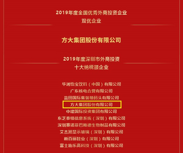 1月8日,全國優(yōu)秀外商投資企業(yè)年度評選深圳榜單揭曉,方大集團榮獲2019年度全國優(yōu)秀外商投資企業(yè)——雙優(yōu)企業(yè)和2019年度全國優(yōu)秀外商投資企業(yè)深圳市十大納稅額企業(yè)。