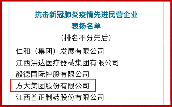 近日,中華全國工商業(yè)聯(lián)合會發(fā)布《全國工商聯(lián)關(guān)于對抗擊新冠肺炎疫情做出優(yōu)異成績的先進民營企業(yè)予以表揚的通報》,對“抗擊新冠肺炎疫情先進民營企業(yè)”給予表揚,方大集團榜上有名。