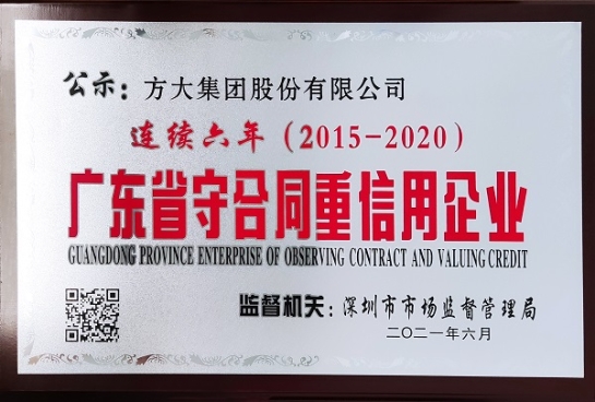 近日,廣東省市場(chǎng)監(jiān)督管理局的2020年度“廣東省守合同重信用企業(yè)”評(píng)選揭曉,方大集團(tuán)憑借優(yōu)秀的公司治理及合同管理連續(xù)六年(2015-2020)榮獲“廣東省守合同重信用企業(yè)”稱號(hào)。